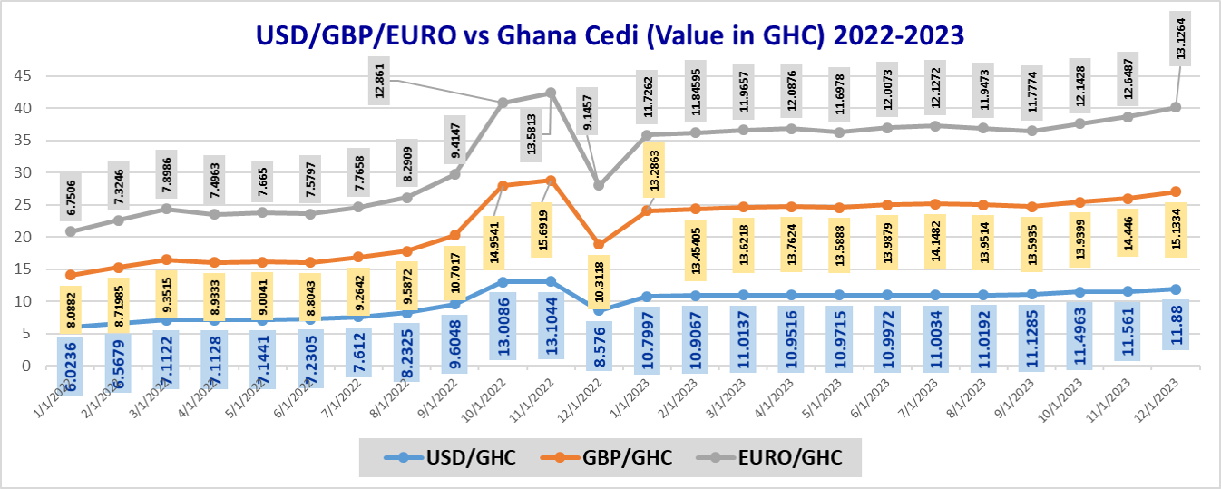 The value of the Ghana Cedi depends on many economic factors, which include trade (export, import, balance of payment) and capital in-flow (Foreign direct investments, remittances) and gold reserves. The value of the Cedi is also influenced by the country's economic prospects (fiscal stability, sustainable debt, economic growth). Gross International Reserves (GRI) also contributes to the stability of the cedi. Capital outflows weakens the Cedi.