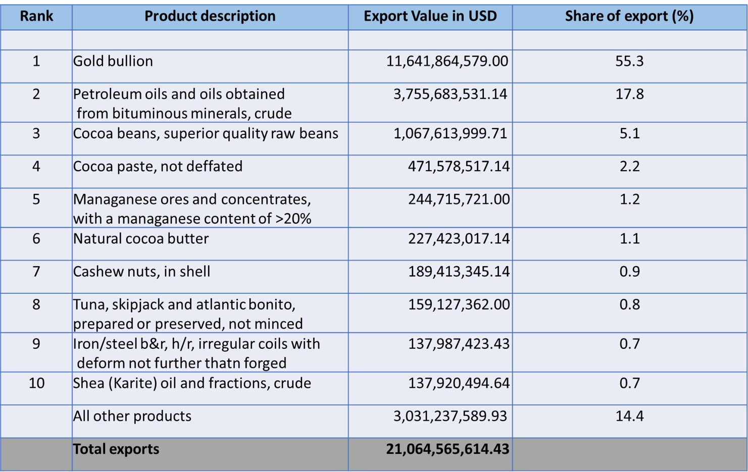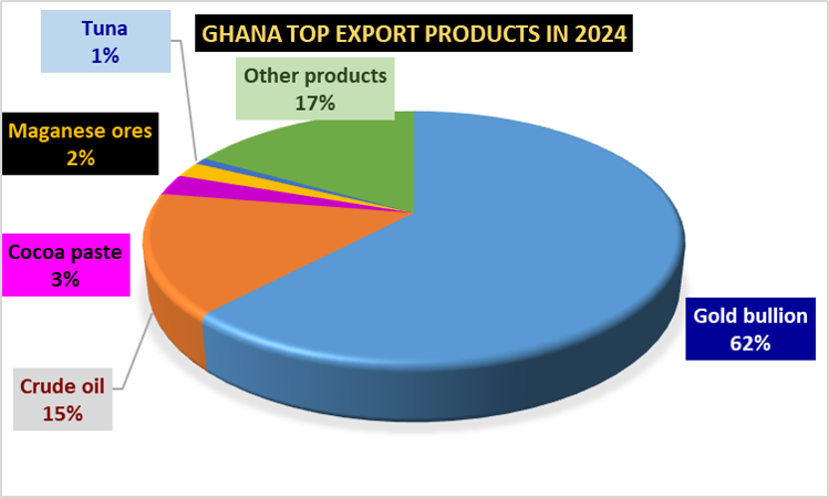 Ghana has developed policies to diversify its export by seeking new partners and by creating a domestic value chain before export. For example, the United Arab Emirates, Switzerland and South Africa are the main export destinations for Ghana. Exports to these countries were more than a third of the total value of exports in 2024. Three countries were the destination for 91.0 percent of gold exports: Switzerland (36.5 percent), the United Arab Emirates (36.5 percent), and South Africa (18.0 percent).